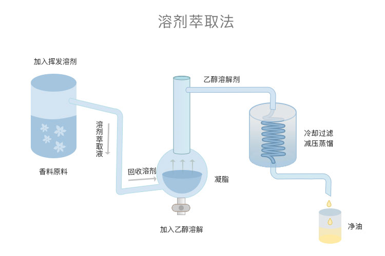 nosetime.com 欢迎您溶剂萃取法主要采用己烷或二甲醚等挥发性溶剂,用这些溶剂反复洗涤花瓣,让花瓣中的芳香物质转移到溶剂中,随后再将溶剂蒸馏,分离之后得到含有挥发性油的凝脂(concrete)。
