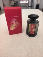4、馥郁版冥府(黑瓶红标,标上有彼岸花图案):浓度不一样,这是EDP浓度的。配料表和EDT版本的不一样,但气味上差别不是很大。只是在EDT淡香版本上做了叠加,适当加重了焚香的烟熏感和花香的甜度。叠加的幅度不大,总体而言也还是挺淡的,并不会因为中文译名加了“馥郁”两个字就变得浓重起来。留香也没有加强到哪里去。