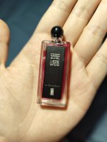 一开始闻的是送的0.2ml分装,因为太火,没啥兴趣,直接粗暴的打开了包装直接闻。讲真,我是闻到了一股血锈味道的,应该是胡椒(晕血患者对这味道很敏感)。所以,有妹子说闻到了大姨妈味也不奇怪了。既然官方香调只列出玫瑰和胡椒,那就直接说说上皮感吧。上皮后,辛辣,冷,慢慢的甜暖微酸话梅感混合着玫瑰,带着粉感冒了出来。留香很长,在抱枕上留香半个月。看有人说这是一朵在雪地里绽放的带刺红玫瑰,结合她的颜色,脑补下还是很美的,差不多就是这种感觉吧。冬天穿黑大衣,涂姨妈色唇膏,眼妆不要太重(因为是少女啊),用这瓶很带感的。