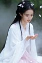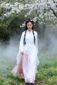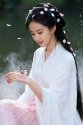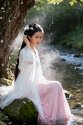 走到溪边的老槐树下,她便停下脚步,侧身坐在树下的青石上。阳光这时刚好穿透薄雾,斜斜地落在她身上——她穿着一件洁白色的薄衫,阳光透过衣料,在她腰间晕出淡淡的光影,像给纯净的白镀了层柔纱。她抬手将垂落的发丝别到耳后,手腕转动的弧度极轻,带着少女特有的柔和,连风都似被这姿态打动,放缓了脚步,轻轻掀起她的衣摆,也捎来一缕缕清透的气息。
