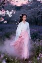 有路过的风好奇地绕着她转,想探探这浑身带着粉雾气息的少女,究竟藏着多少秘密。可她从不刻意展露什么——她会在雾浓时轻轻皱眉,担心花瓣被雾打湿;会在看到溪边的小鱼游过时,悄悄伸出手指,想碰一碰水面,却又在指尖快碰到溪水时收回,怕搅乱了鱼群的自在;也会在夕阳西下时,起身整理裙摆,将落在上面的花瓣轻轻拂下,让它们回到花丛里,像是在跟春光告别。